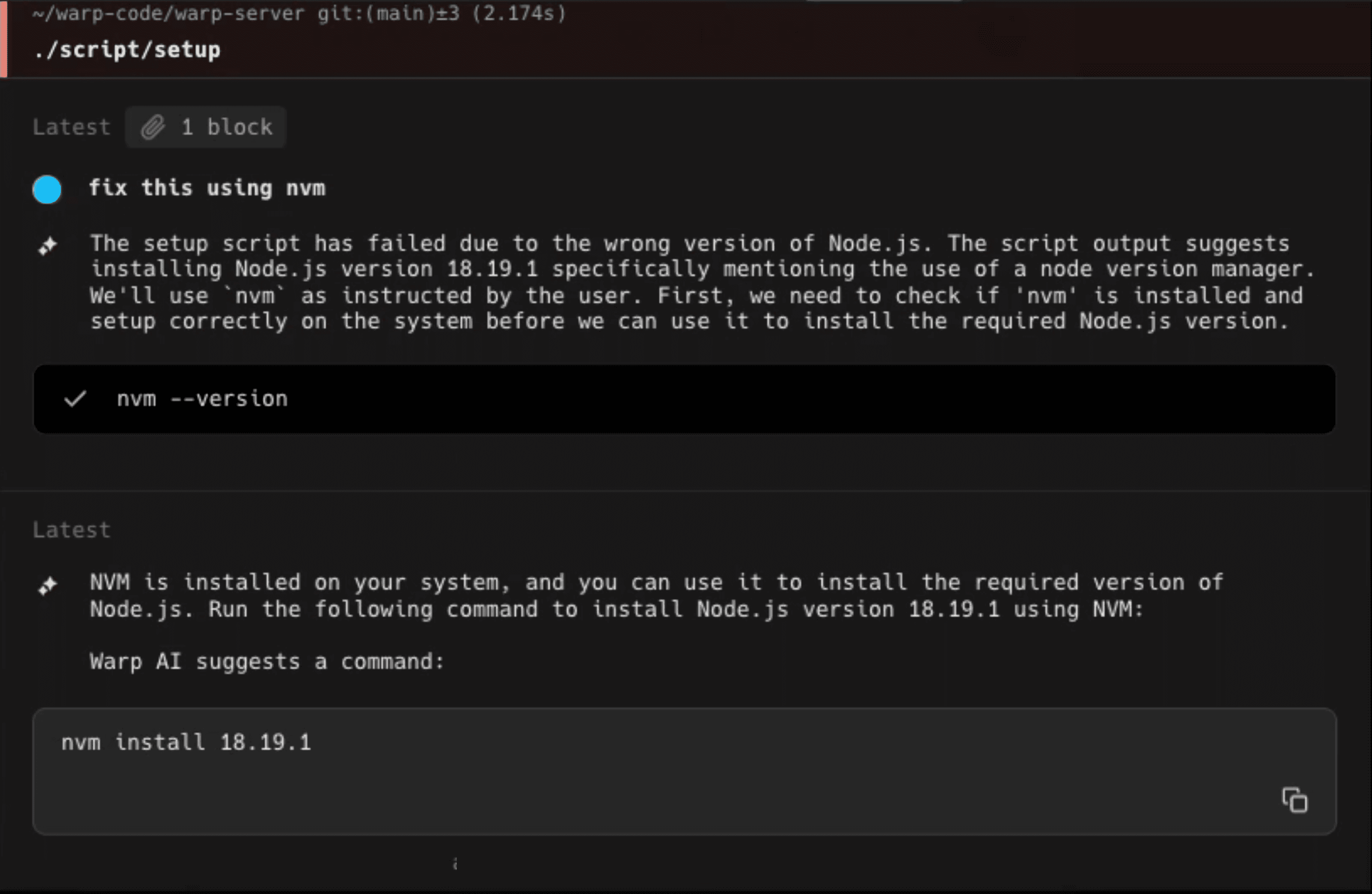 If the AI agent doesn’t have enough context, it will attempt to gather context by running commands on your machine with your approval at every step. For example, when solving an out-of-date node dependency for you, it first asks to run “which nvm” to check which node manager you use. It is only when it knows your node manager that it suggests you install the right node version nvm install 18.19.1.