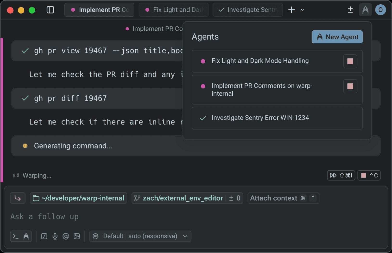 Warp's Agent Management Panel lets you run multiple agents at once. Track agents as they tackle complex tasks, and step in easily when they need help.