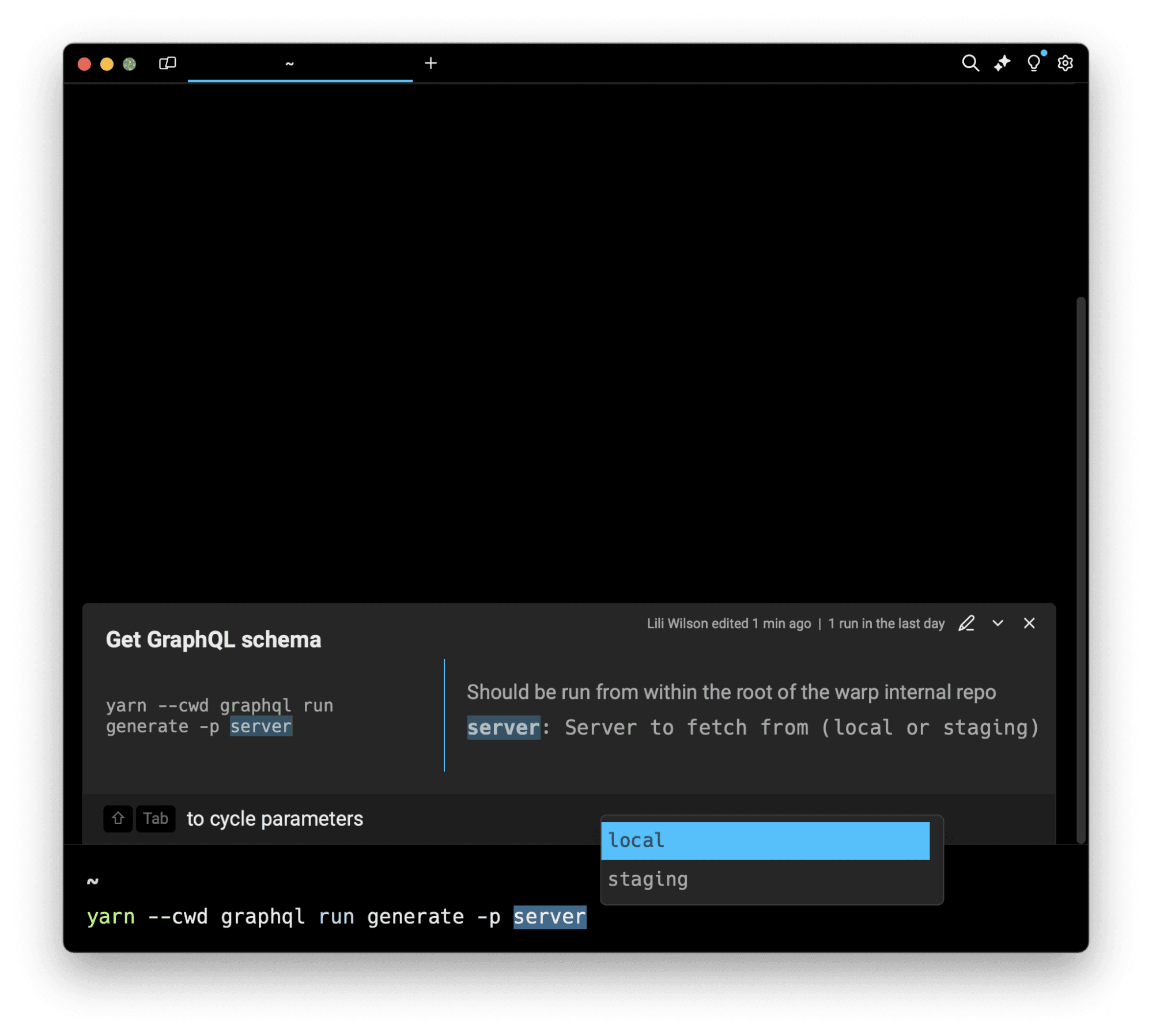 It’s been awesome to bring enum arguments to life over the course of my internship, and I’m super excited to be shipping it. As someone who had to go through the onboarding process onto the Warp team this summer, this is a feature I found myself wanting a lot when encountering new team workflows.