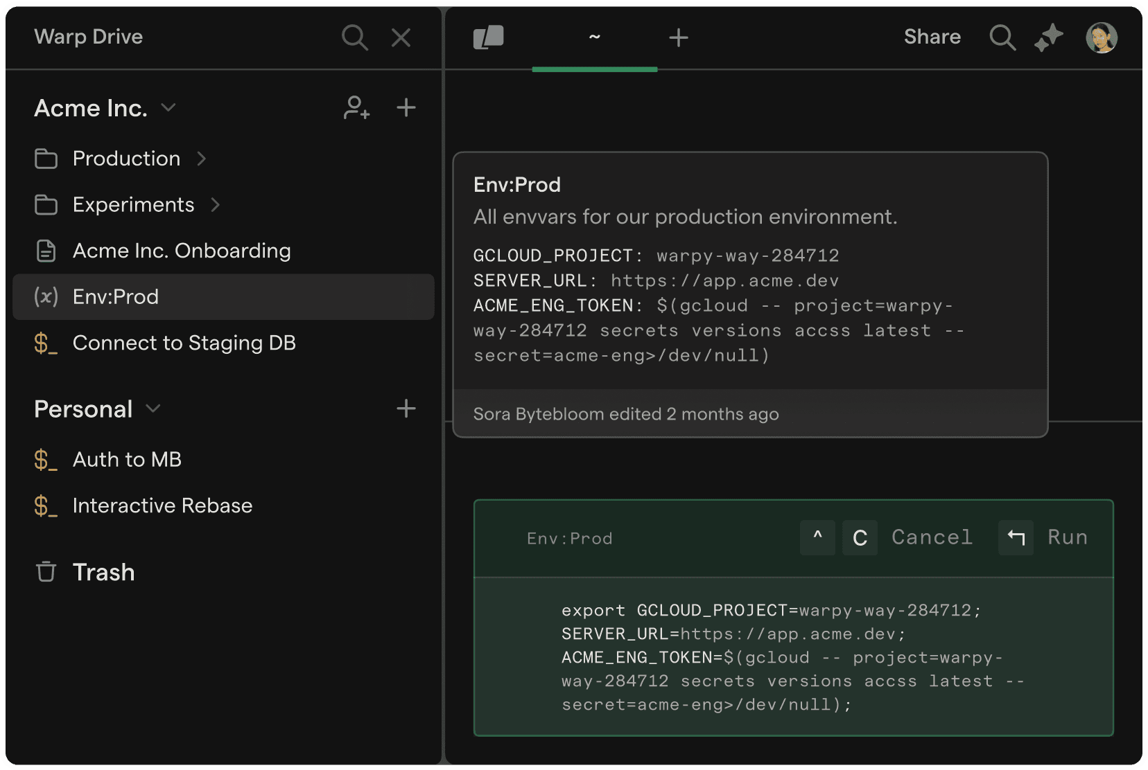 Warp will import packages, manage dependencies and clean up versions - say goodbye to struggling because the wrong version of Python is installed. Environment variables let you store and import API keys and passwords into your sessions securely.