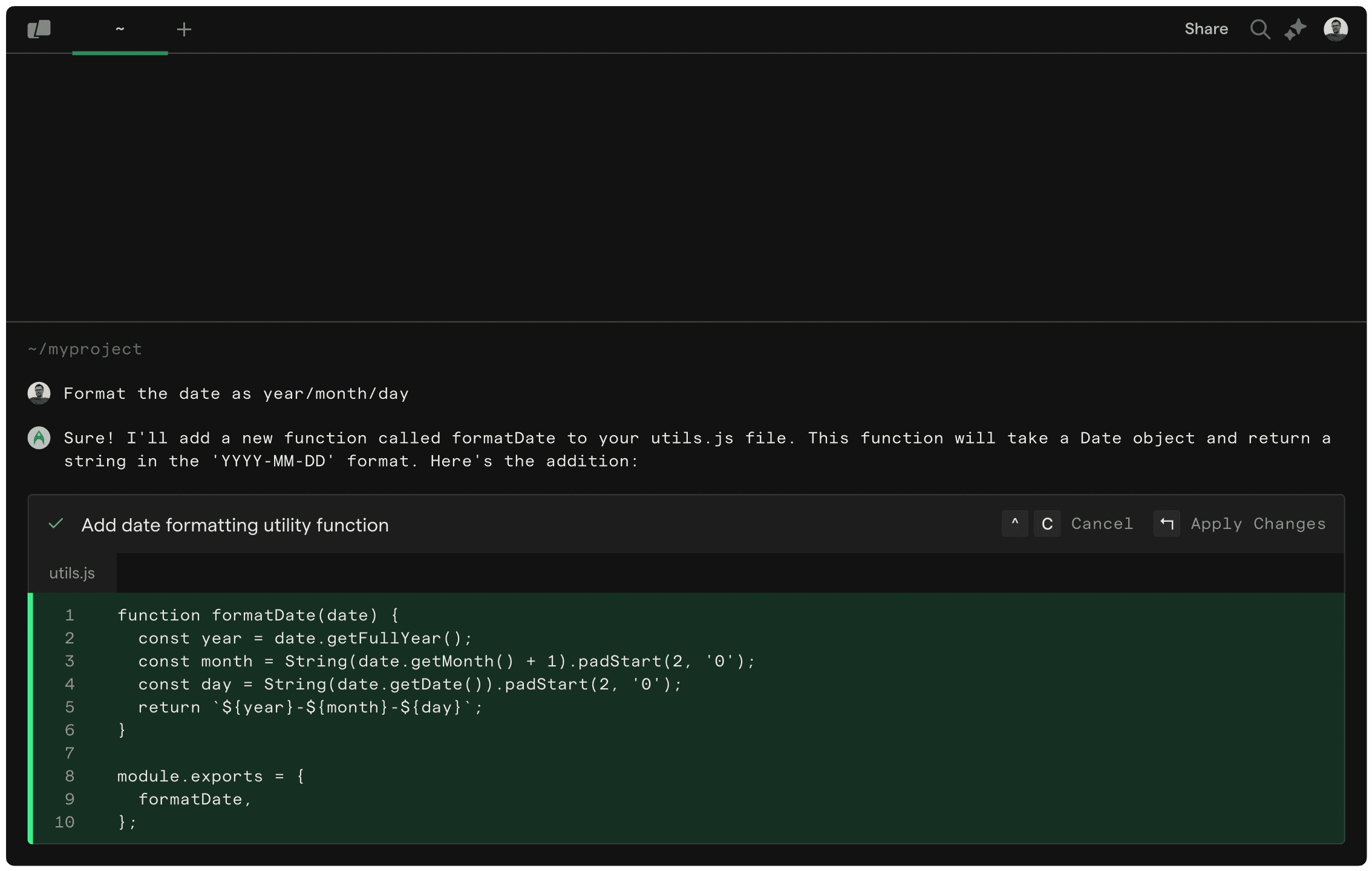 Warp will find the right place to add code, apply a diff and move on to the next step. You can view the changes made, confirm acceptance and make suggestions.