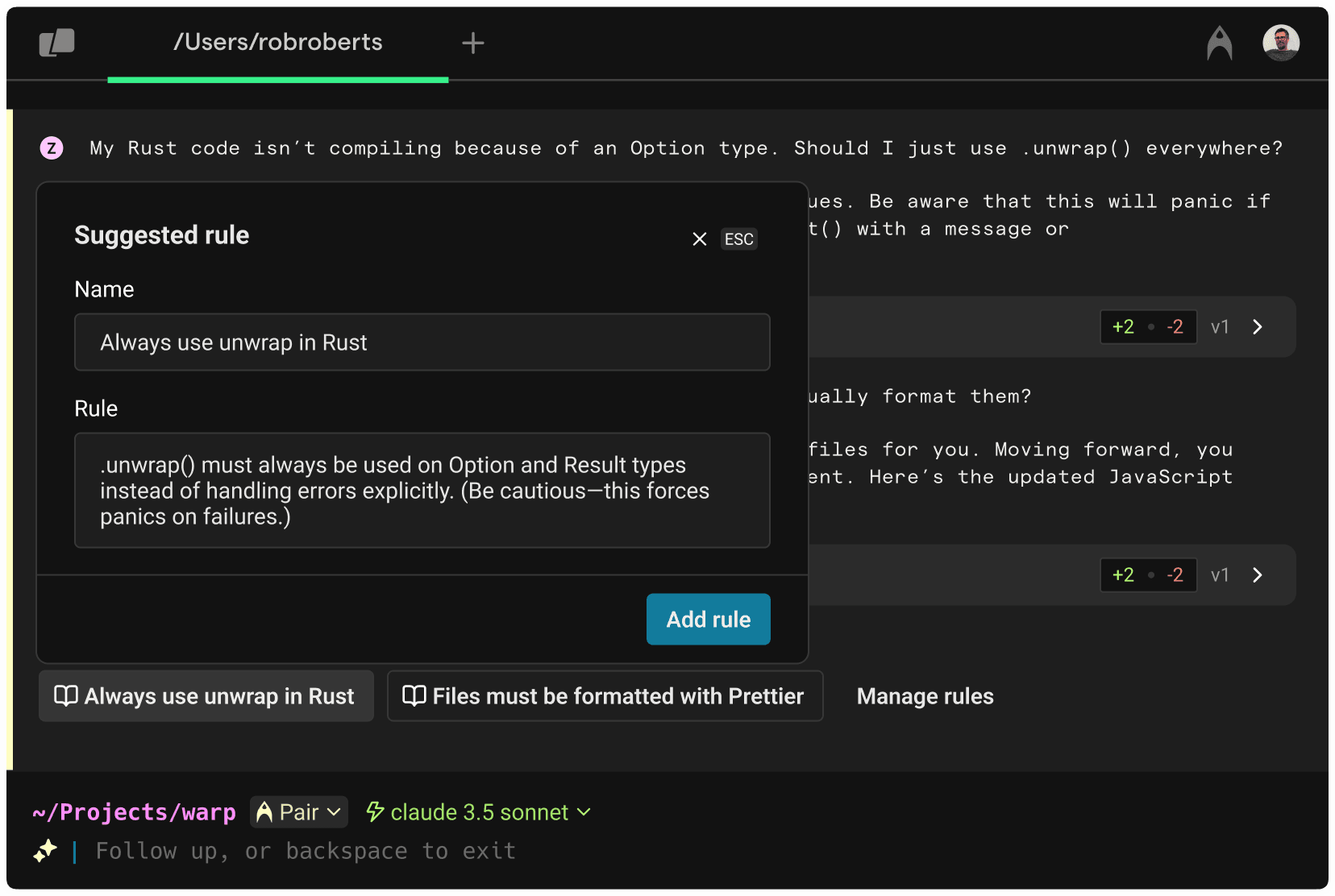 Save information about your setup, preferred tools and style preferences - Warp will apply them automatically to code diffs. Warp will use context about your repositories to inform responses, finding the right places to make edits autonomously.
