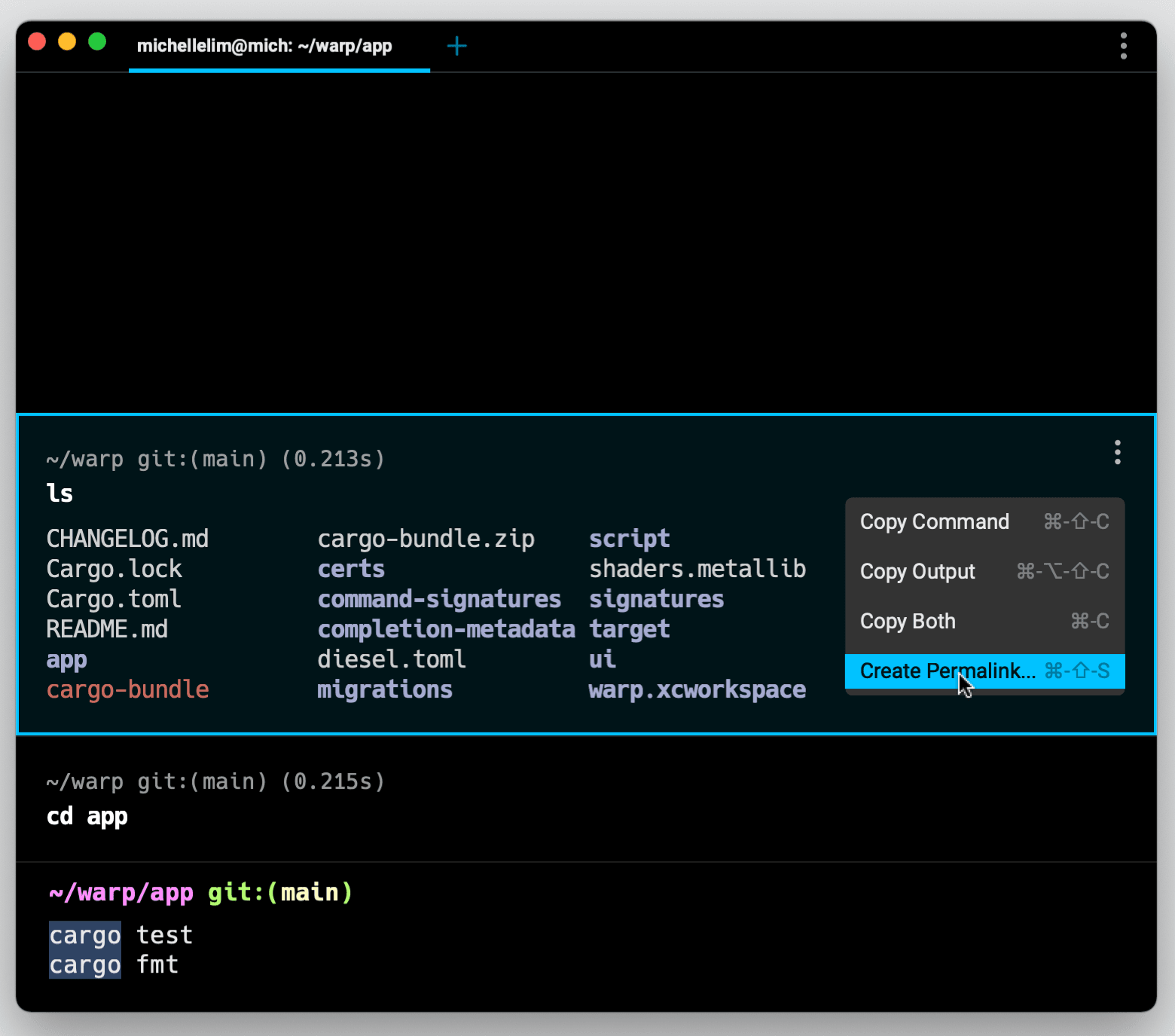 By default, Warp keeps the input prompt and command line “pinned” to the bottom of the view. This is similar to how inputs work for other work applications like Slack. Your past input and output get grouped together in blocks that flow up and out of view. You can scroll up or navigate up to visit your past commands. However, this is rather unusual behavior for a terminal application.