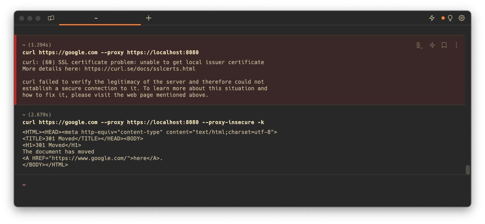 In situations like this, you can use the --proxy-insecure flag together with the -k / --insecure flag above to bypass the security checks.