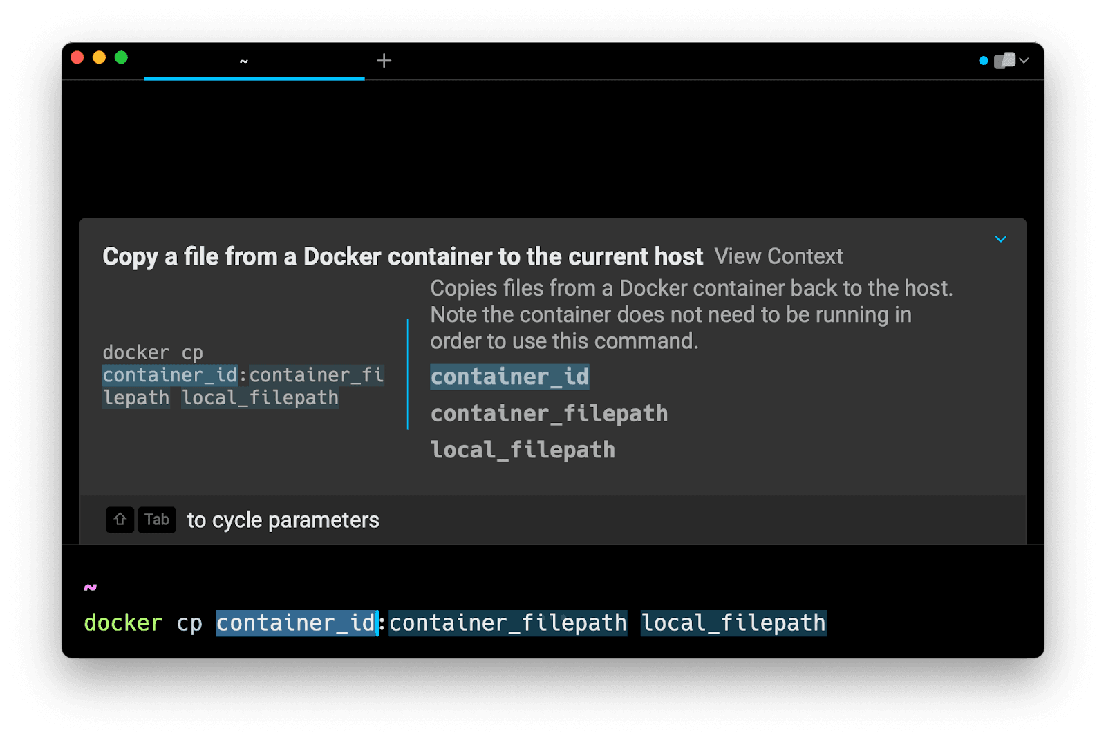 If you’re using Warp as your terminal and you need to quickly retrieve this command, you can use Warp's Workflows feature by pressing CTRL-SHIFT-R and typing copy from container: