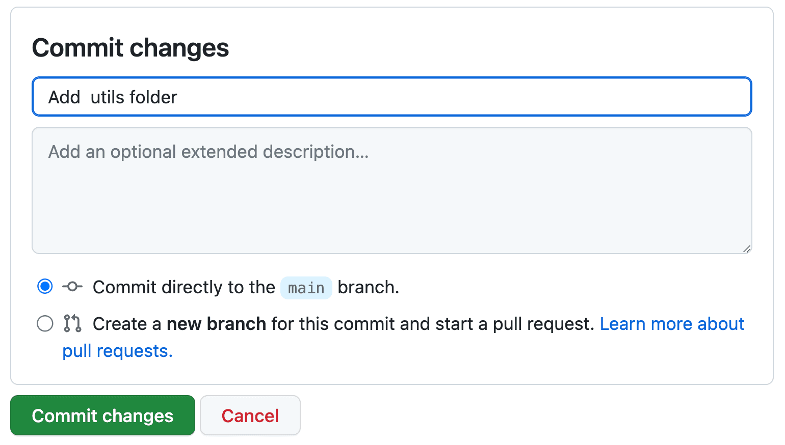- Write a commit message, select the branch to commit the files to, and click on the "Commit changes" button to save the changes.