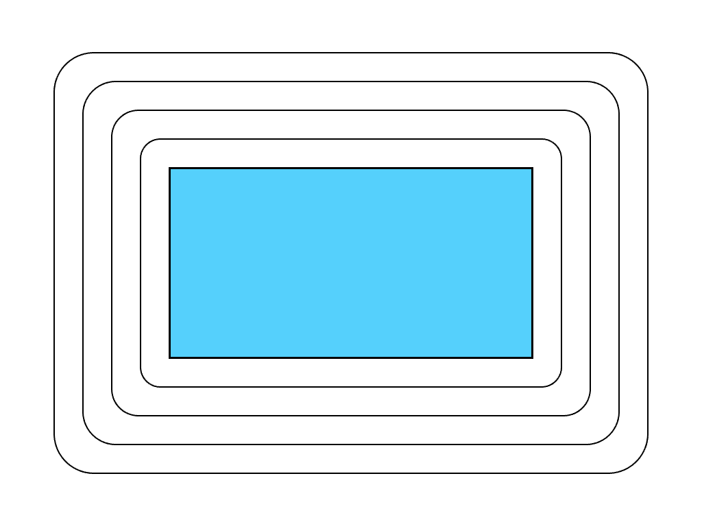 The following diagram draws out four distance fields of a rectangle (lines). Each line represents pixels that are the same distance away from the edge of a rectangle, similar to contour maps in geography. Notice that each distance field matches the outline of rounded rectangles.
