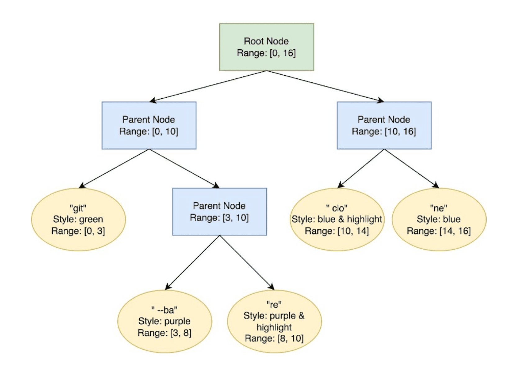 At a high level, we use a concept similar to these “parts” to represent snapshots of text state, including styles. At a lower level, within the input editor, we represent text using a SumTree custom data structure, which is similar to a Rope data structure used in other text editors. It allows us to index into the data in different dimensions quickly (e.g. based on characters, bytes, lines, etc.) The benefit is that many operations generally can be achieved in O(log N) time.