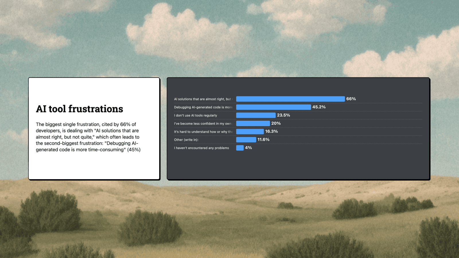 66% of respondents cited "AI responses that are almost right, but not quite" as their biggest frustration with agentic coding. (Stack Overflow 2025 Developer Survey, AI)