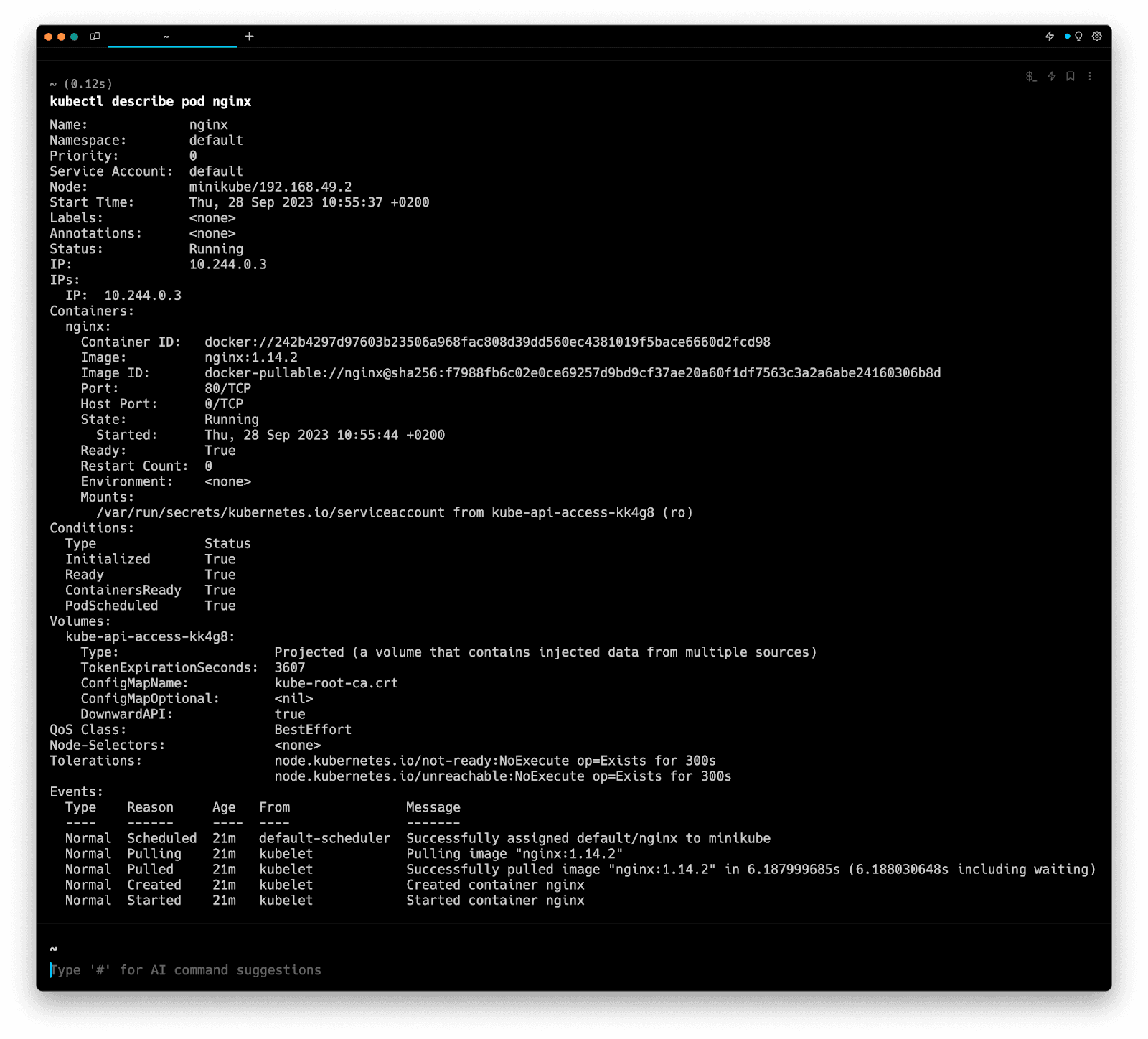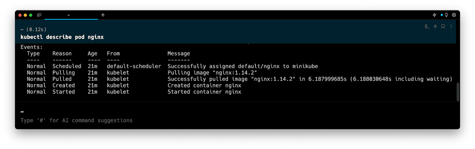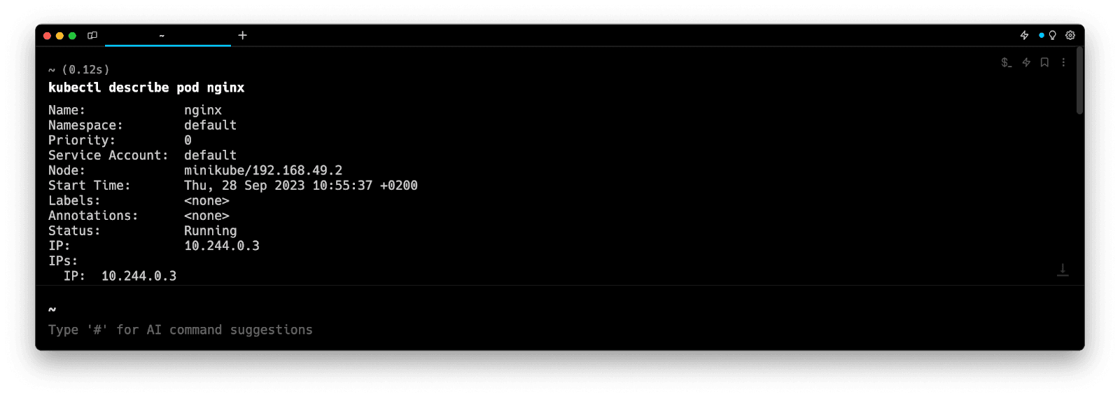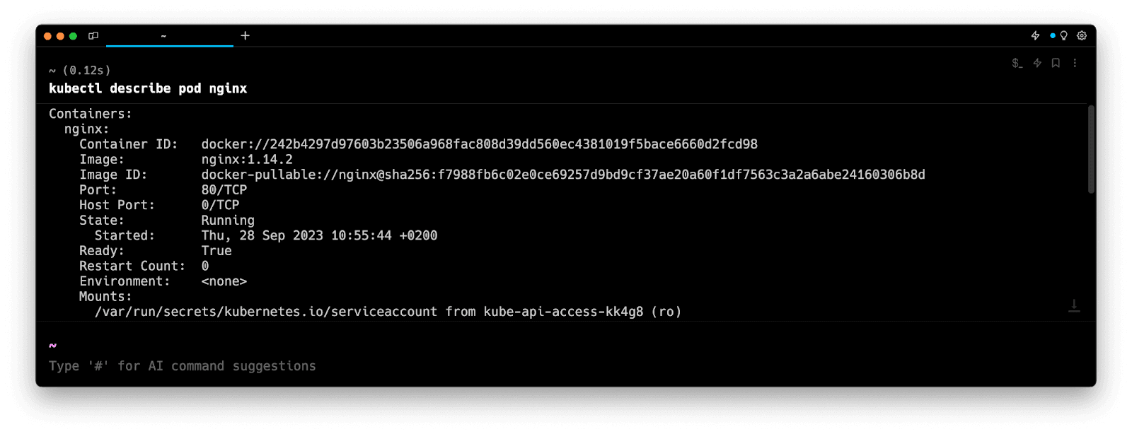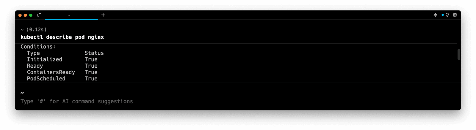 Entering k8 describe pod in the AI Command Suggestions will prompt a kubectl command, which can be inserted quickly into your shell by doing CMD+ENTER.
