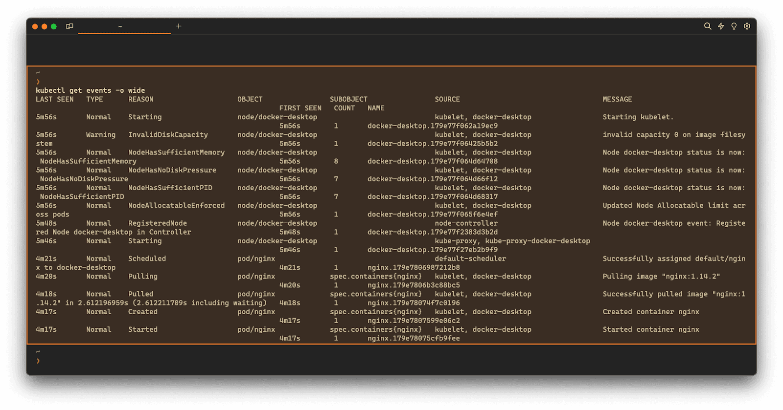Upon execution, the above command will output verbose details about the events like last seen, type, reason, object, and message.