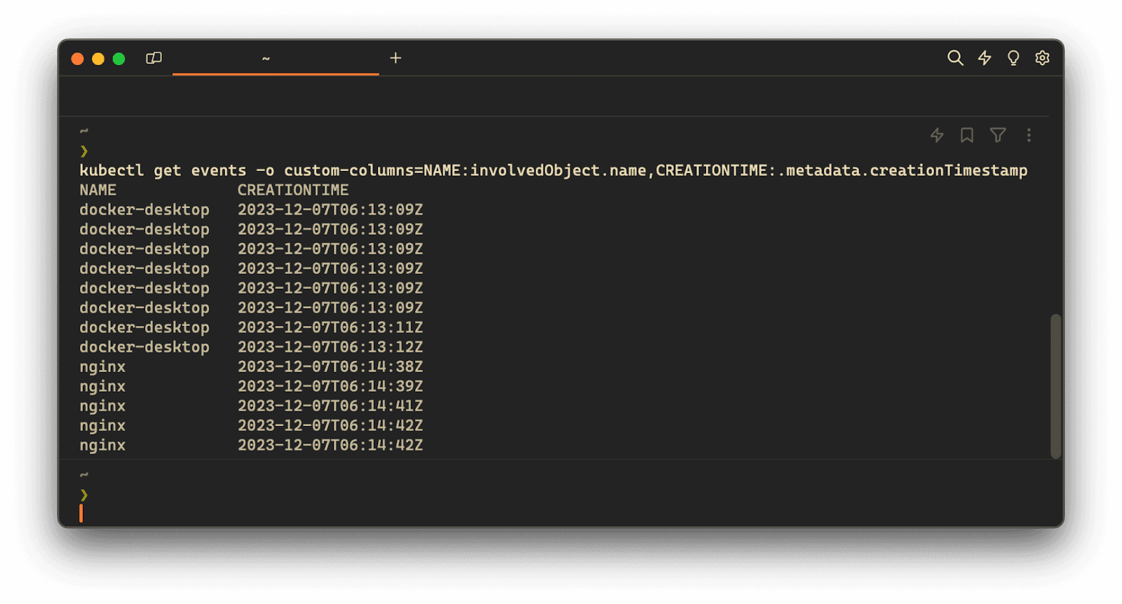 Upon execution, the above command will output two columns, NAME populated with the value of involvedObject.name and CREATIONTIME populated with the values of .metadata.creationTimestamp.