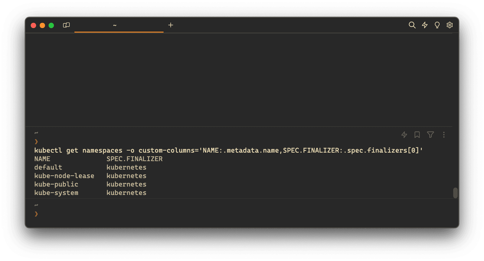 Upon execution, the above command will output two columns NAME populated with the values of metadata.name and SPEC.FINALIZER populated with the first values of the spec.finalizers .