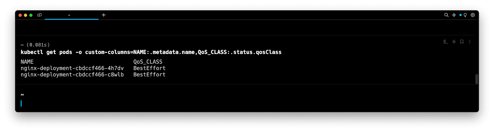 Upon execution, the above command will output two columns, NAME populated with the values of metadata.name and QoS_CLASS populated with the values of status.qosClass.