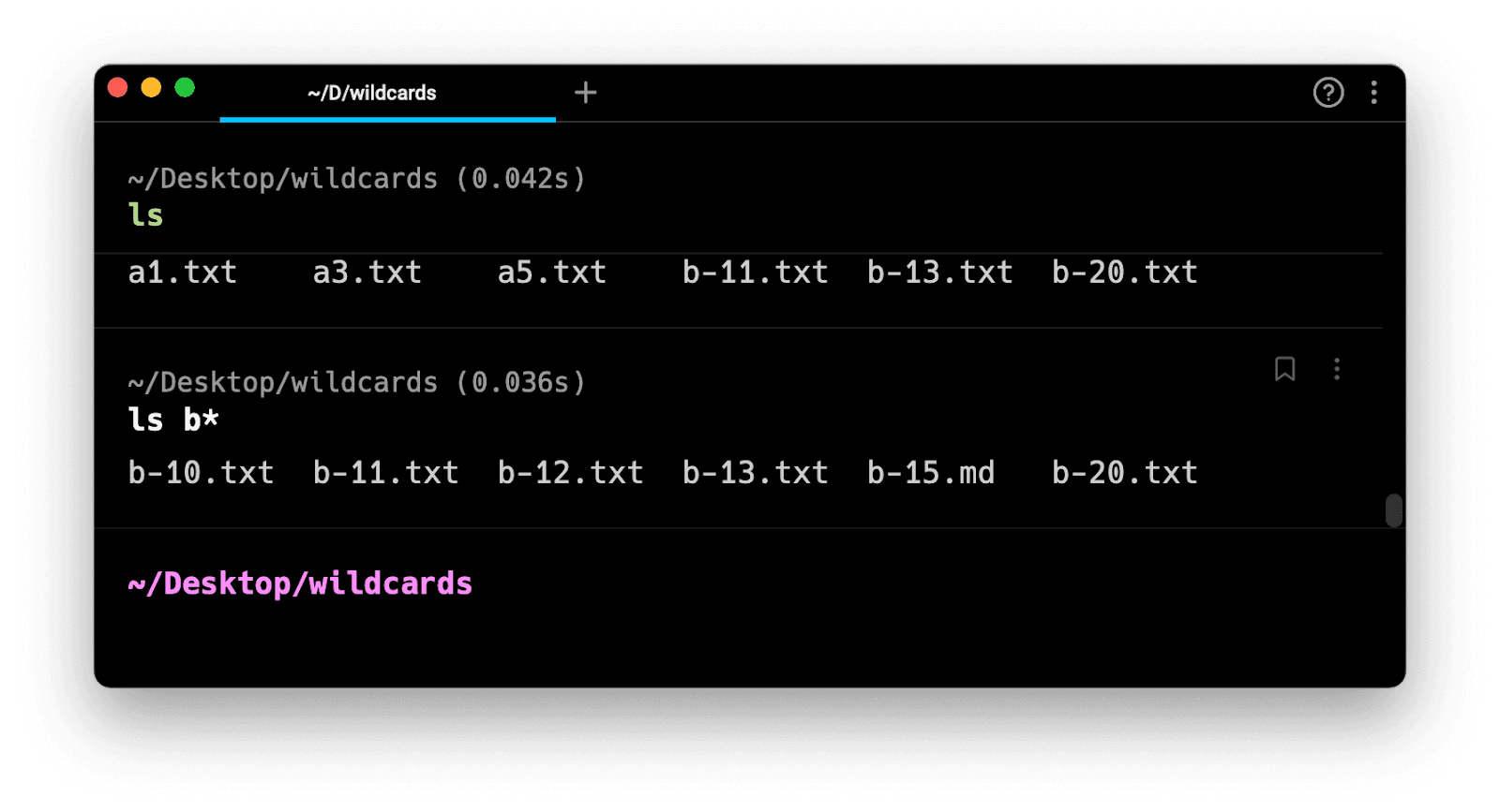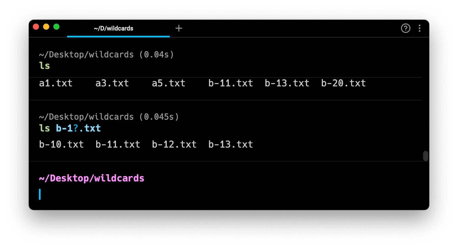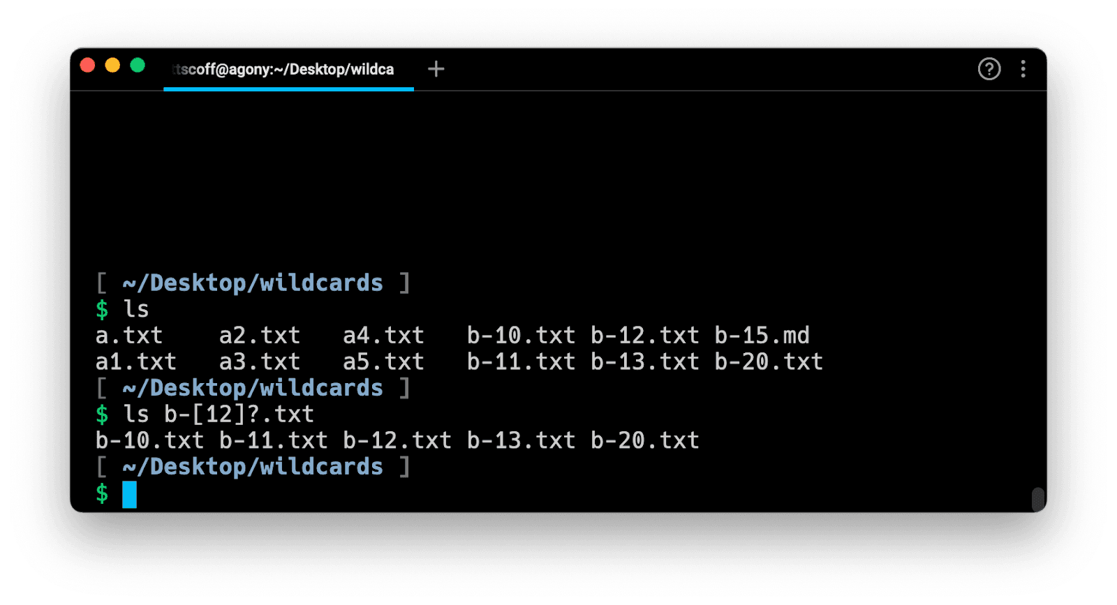There are also square bracket operators in most shells (notably not Fish). These allow you to define a specific character set to match, e.g. myfile-[0-2].txt. That would match myfile-1.txt and myfile-2.txt, but not myfile-3.txt or myfile-10.txt. Square bracket operators can give you more granular matching than * or ?. Note that a square bracket expression can only match a single character; unlike regular expressions, there's no repeat operator. Square brackets can contain a list of individual characters that are matched, e.g. [adg] to match a, d, or g, or a range of numbers or letters to allow, specified with a hyphen between two characters. Matching is case-sensitive, so if you want to match any letter between a and z regardless of case, your expression would be [a-zA-Z]. To replicate the * operator but exclude any non-alphanumeric characters, use [a-zA-Z0-9].