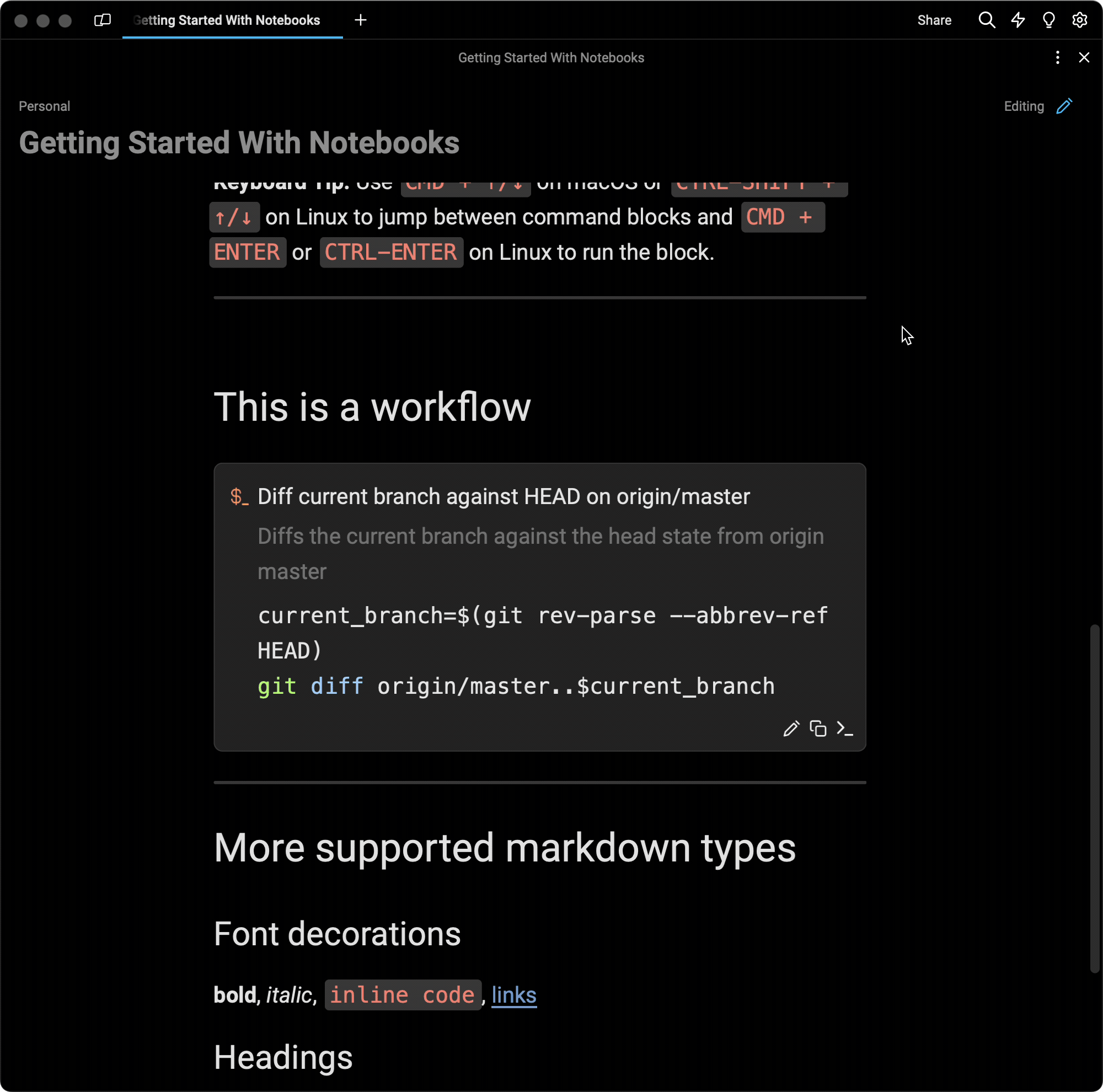 Notebooks are Markdown-flavored, like you’d expect from your favorite note editors, but they can also include interactive code blocks with runnable commands, like a Jupyter notebook.