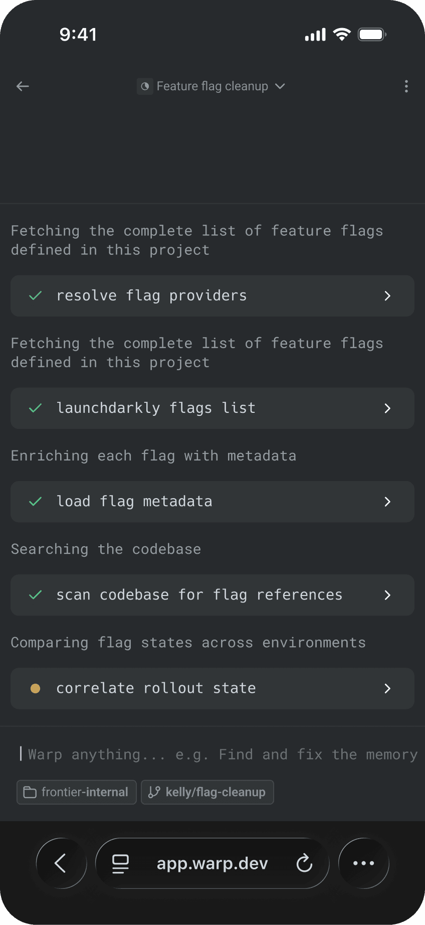 Watch Roland (Product Engineer at Warp) generate a fix to our platform across our server and client repositories in a single prompt... all while he's on a lunch break.