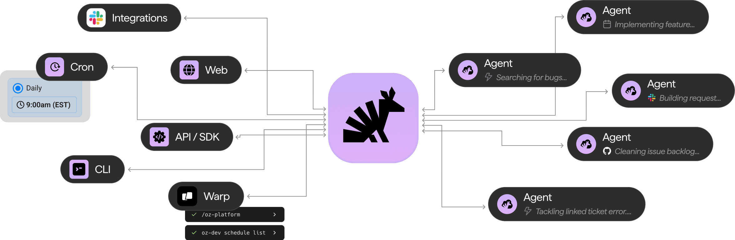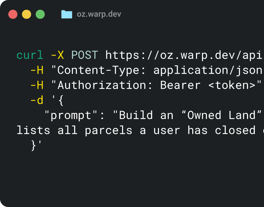 Launch an Oz agent right from our web app. Best for launching coding automations for tasks like PR review.