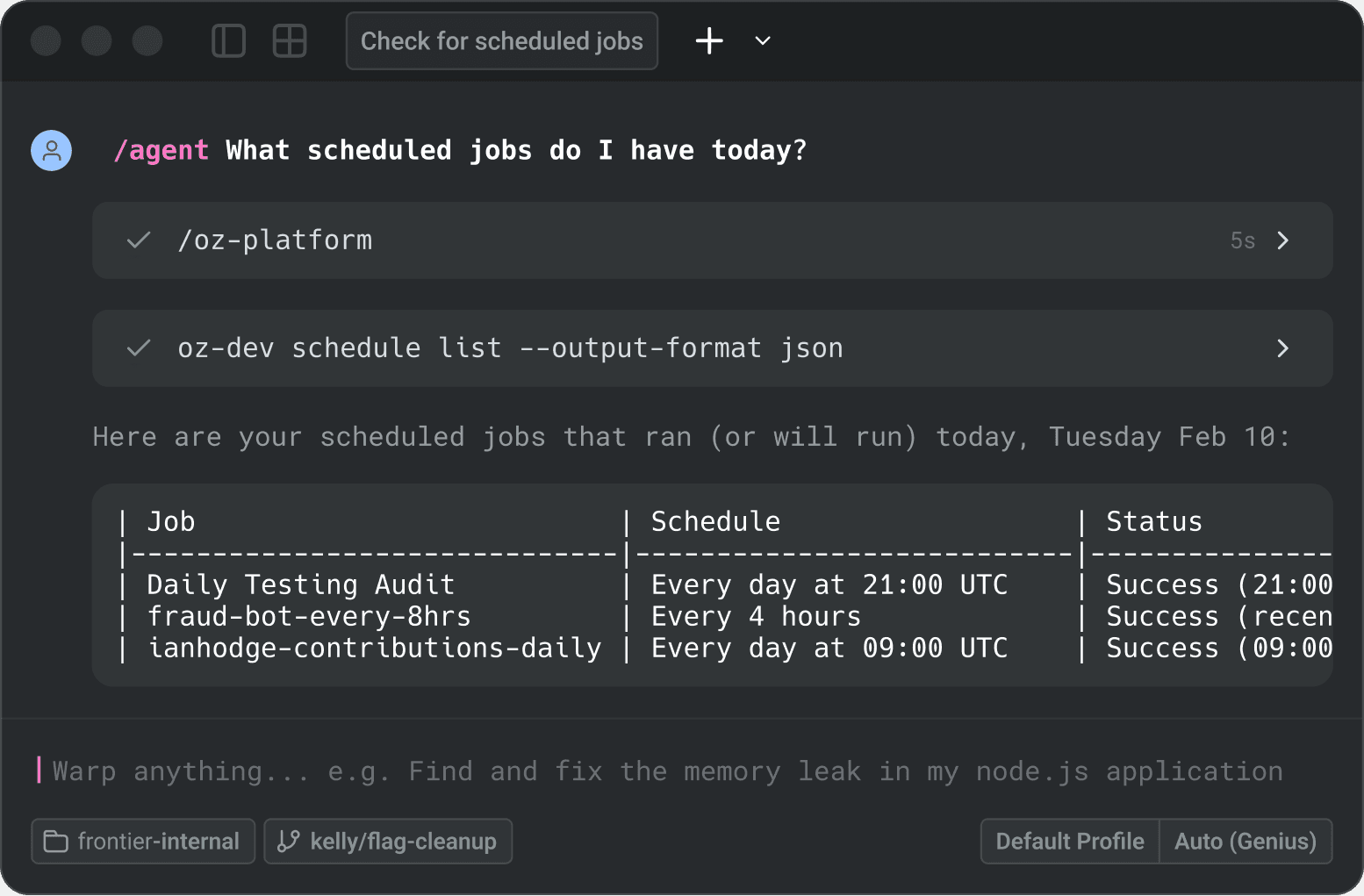Oz automations running daily at Warp