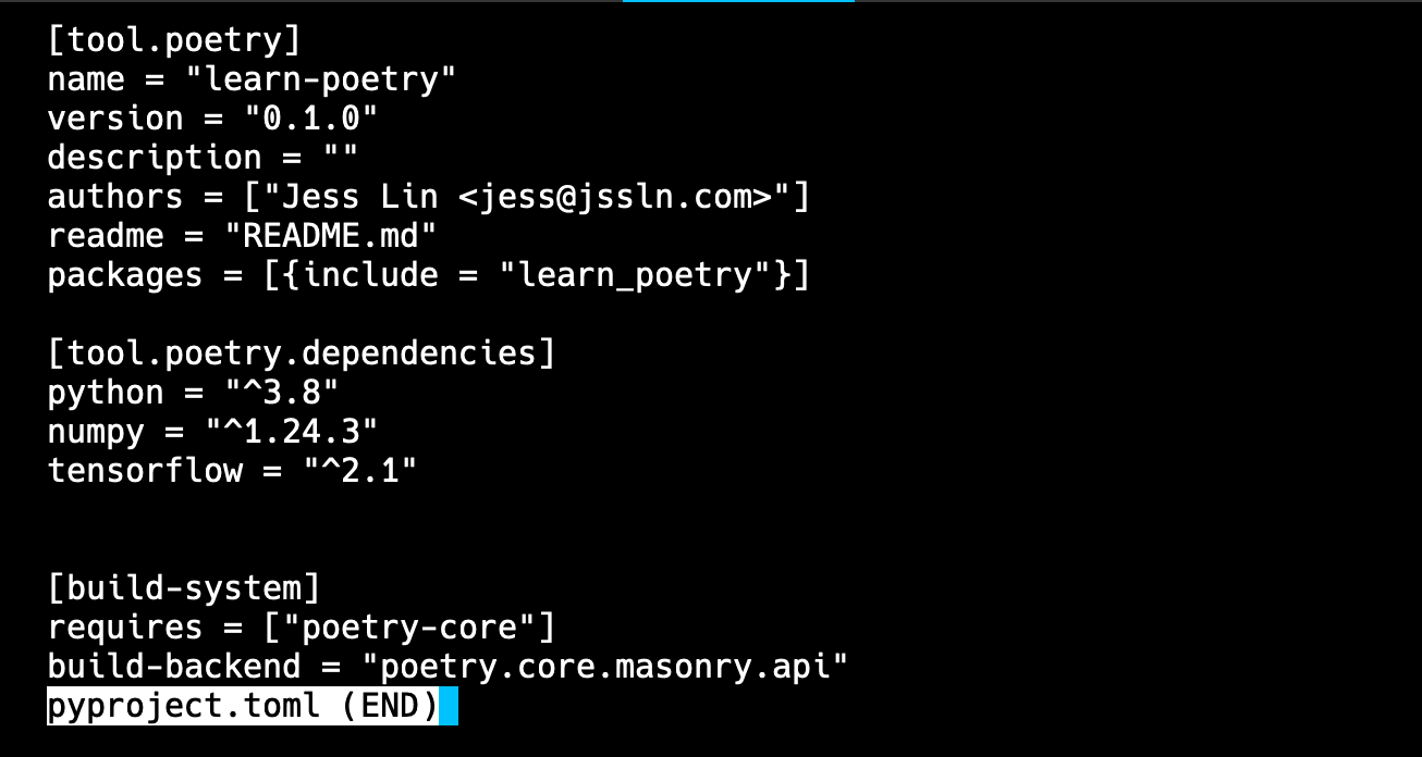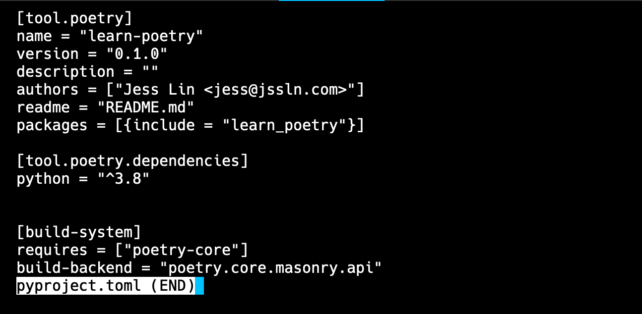 The most notable file here is pyproject.toml. It has three sections: basic package details under [tool.poetry]; dependencies (with the version of Python you used) under [tool.poetry.dependencies]; and build-time dependencies under [build-system].