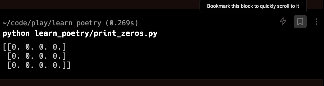 Let’s try that out. As an example, we’ll first create a simple demo script in learn_poetry/print_zeros.py. It uses a dependency of this project, numpy.
