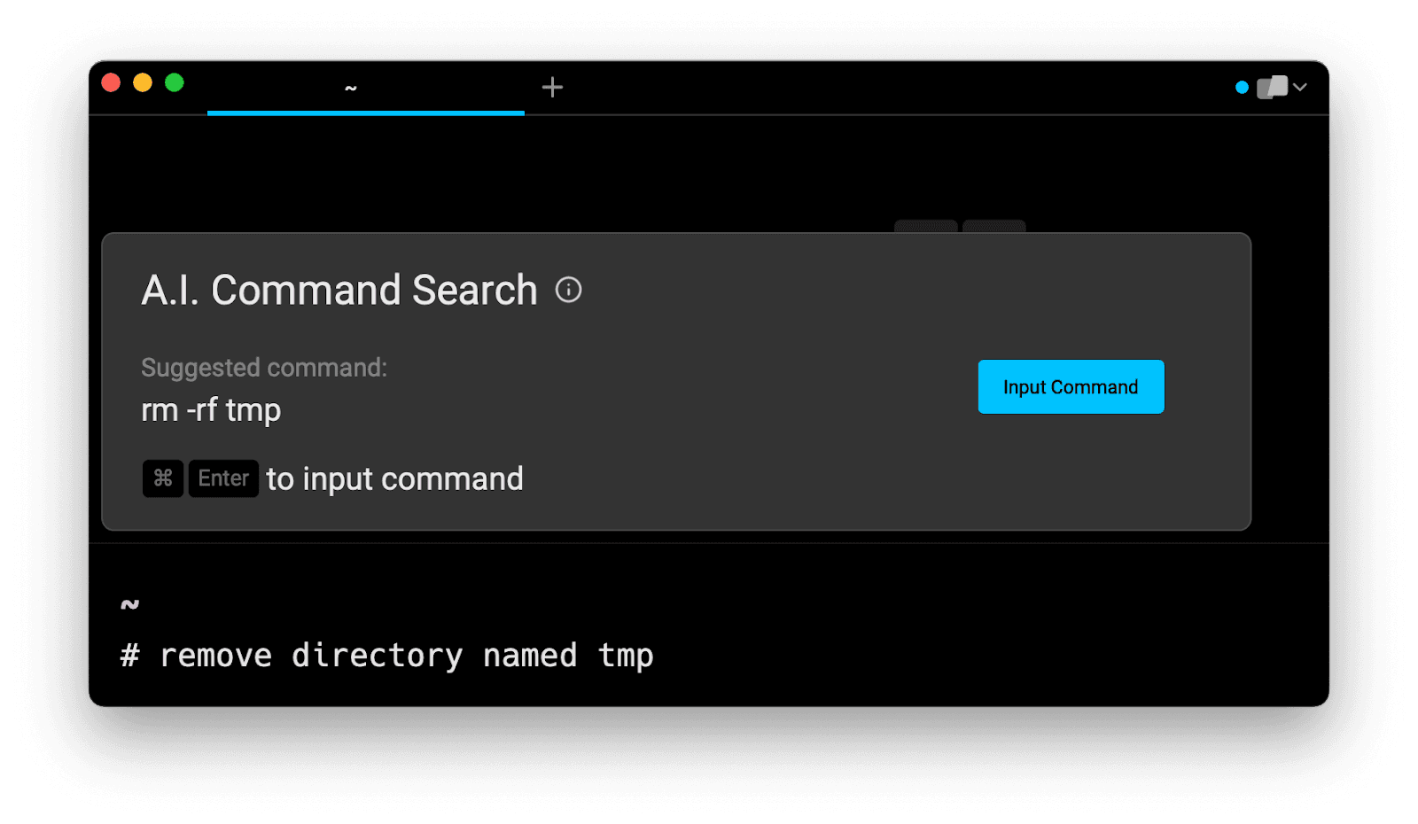 Entering remove directory in the AI Command Search prompt results in rm -rf directory, which you can then quickly insert into your shell by doing CMD+ENTER.
