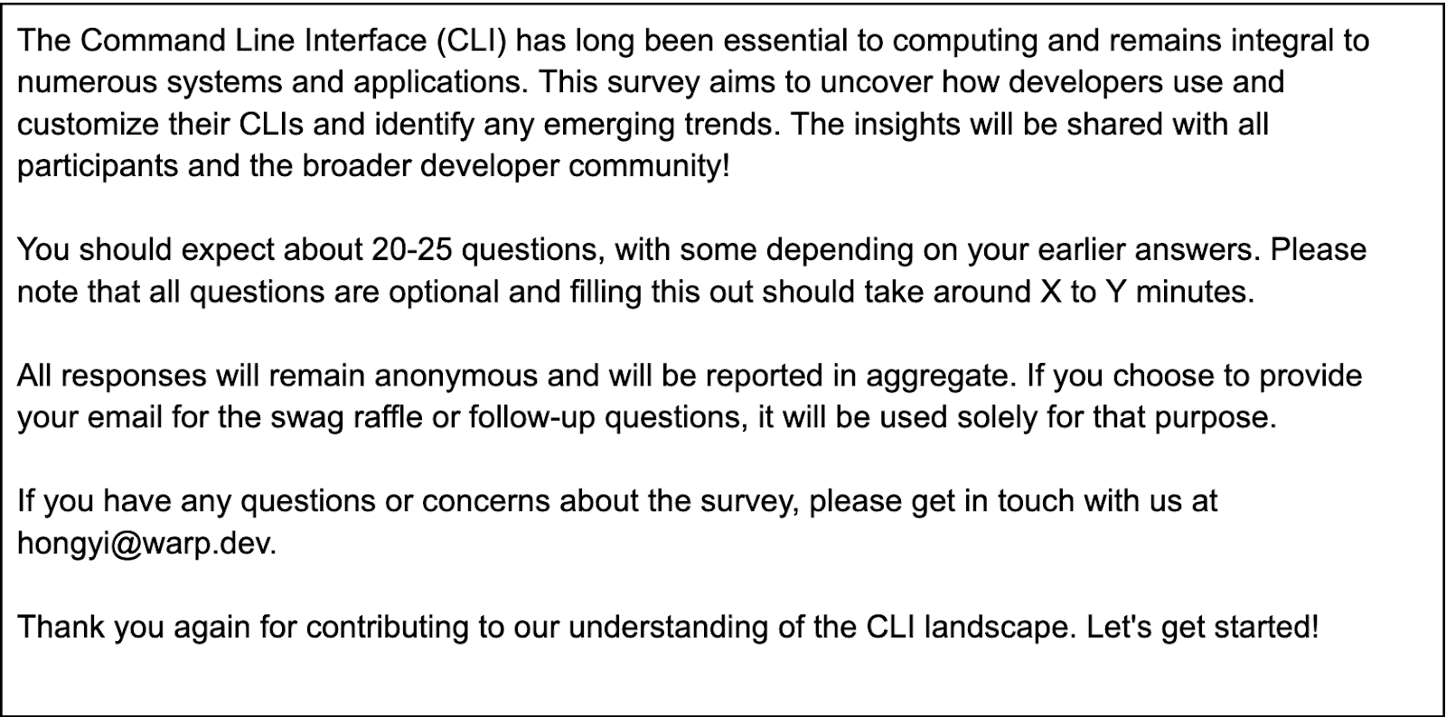An overarching theme was the avoidance of presumed prior knowledge. Our target was all developers, irrespective of expertise levels. Ensuring ease of understanding, we provided the necessary context and meticulously scrutinized the language of each question. A case in point is our clarification on the distinction among CLI, shell, and terminal - concepts developers often muddle.