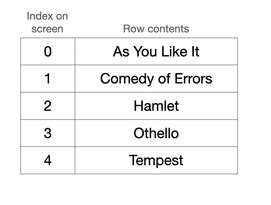 Nevertheless, the whole process of index conversions presupposes that the grid needs to be rotated in the first place. Why is that the case? Why not skip the silly conversions and enforce equivalence between the screen indices and the vector indices, meaning that “As You Like It,” the first row on screen, is also stored as the first row in the vector? Not surprisingly, this is because the grid is heavily optimizing for something else entirely: scrolling!