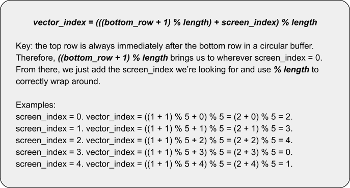 4 Question: this seems to be using bottom_row just to compute the “top row” (where screen index = 0) and it does that for every conversion. Why not just store the “top row” index instead of the bottom? Answer: It’s a really good question. The reality is that converting between “bottom row” and “top row” is some fixed cost of a couple arithmetic operations and, while it’s probably meaningless in most cases, it’s ever-so-slightly preferably to pay this penalty at the time of rendering the grid than at the time of writing the contents of the grid, where it’s a neat optimization to quickly know where the next line of output goes.