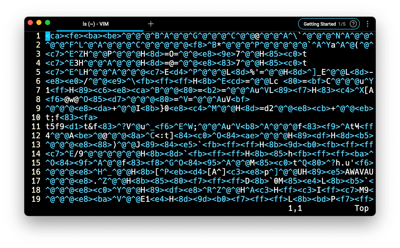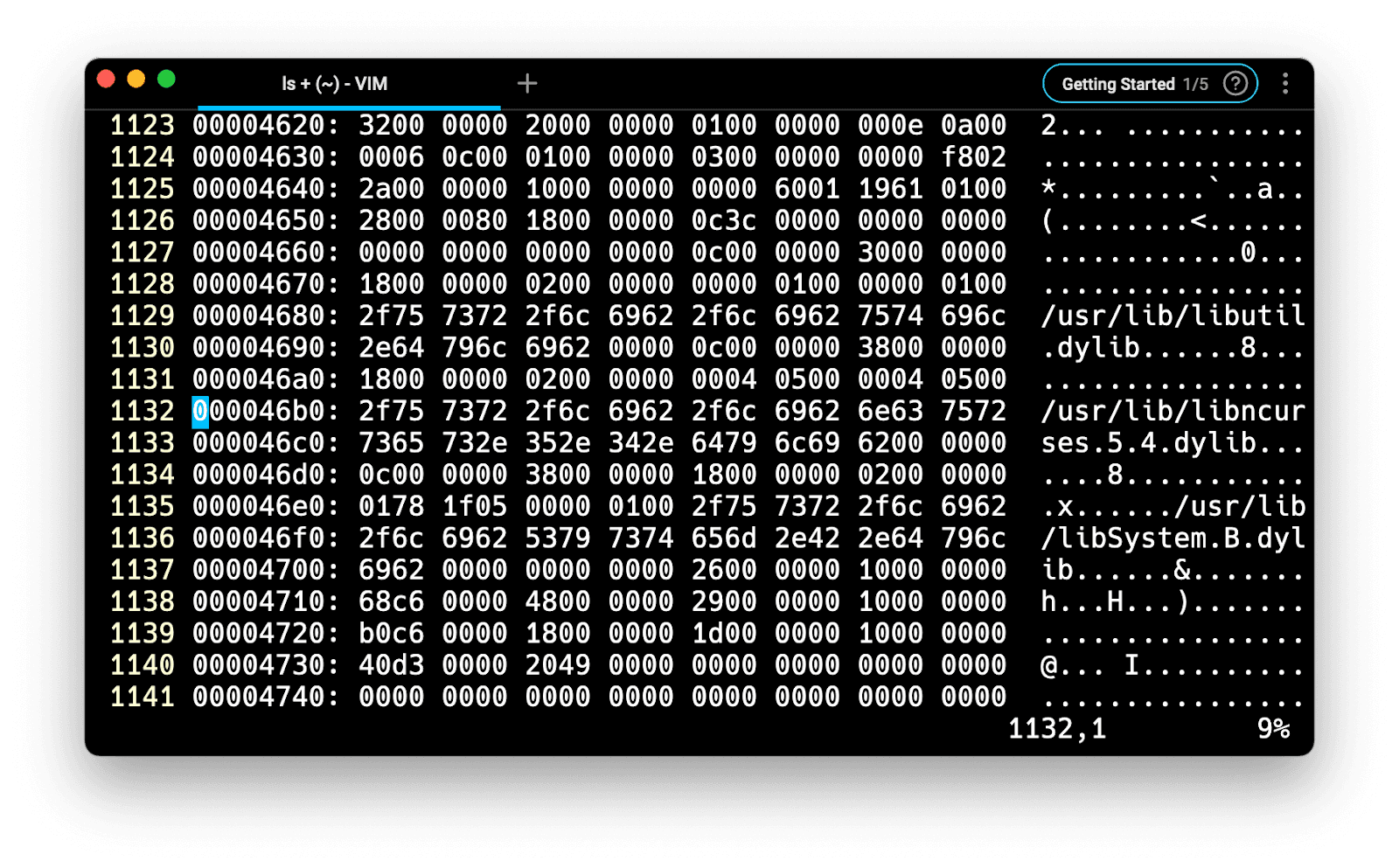 Once you’re done editing the hexadecimal part, you can reverse the hexadecimal bytes to binary using the :%!xxd -r command, and save your file using the :s command. Note that any modifications performed on the right-hand side column will automatically be ignored.