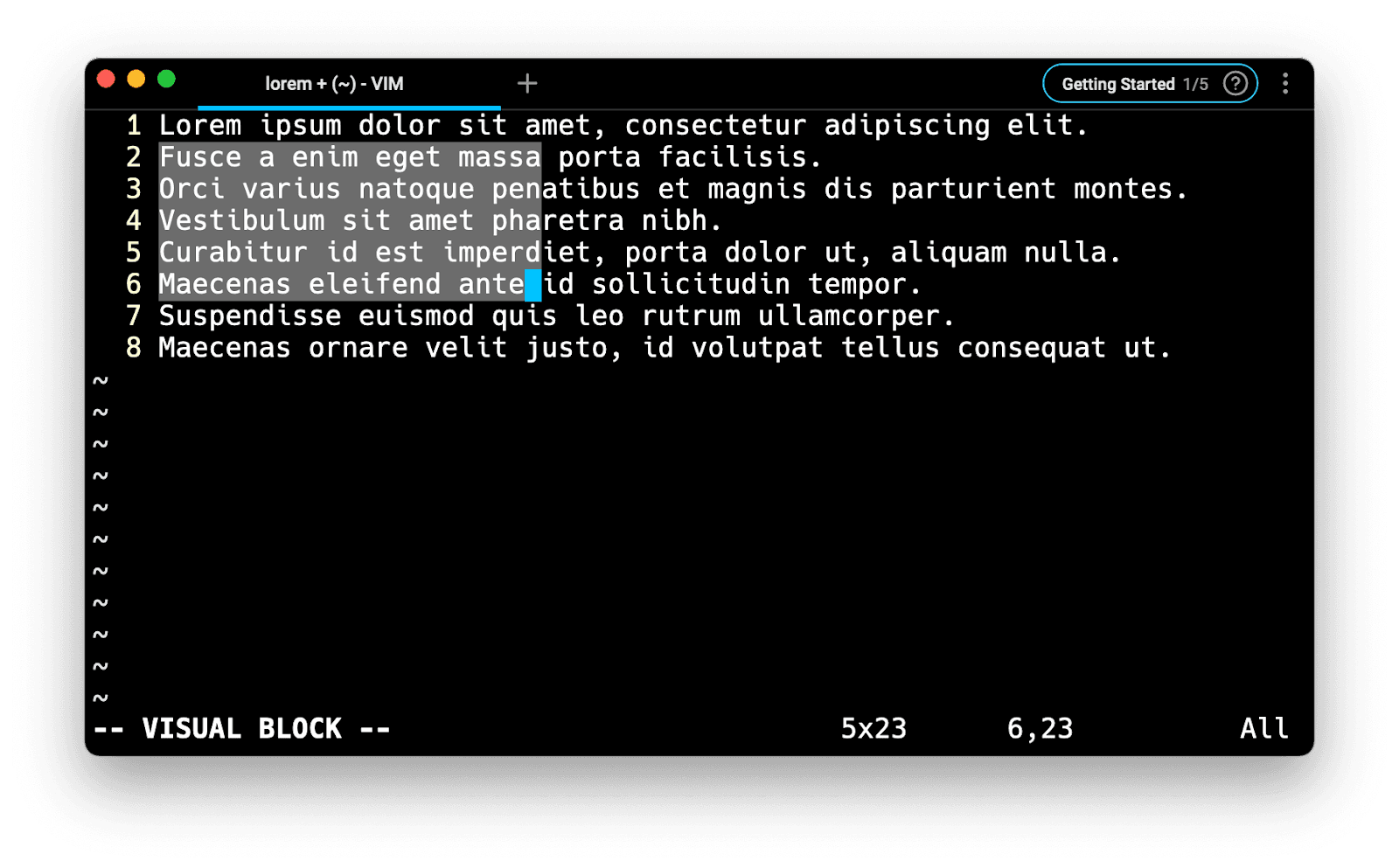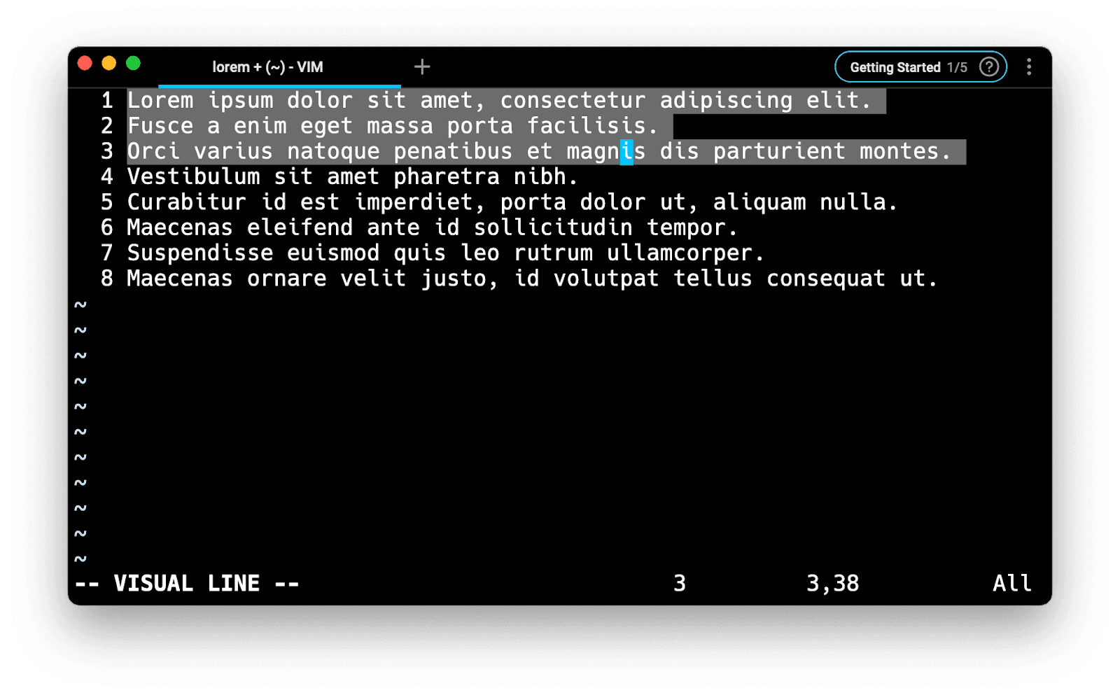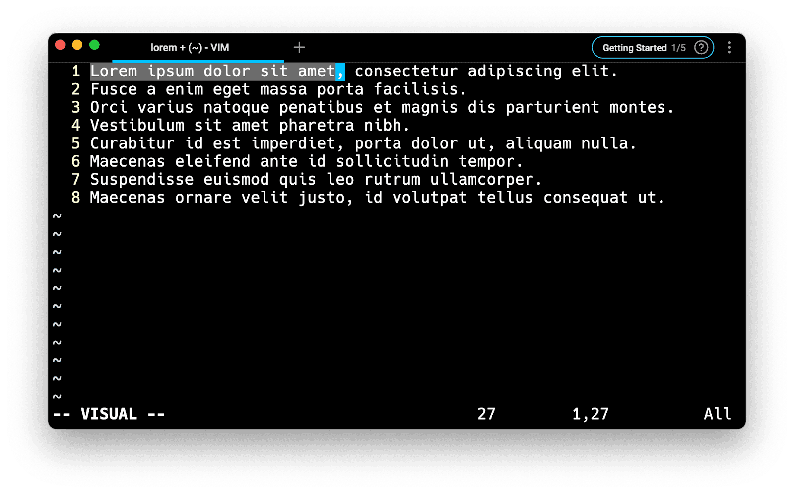 The Visual mode allows you to visually highlight (select) specific text areas and run commands on them.
