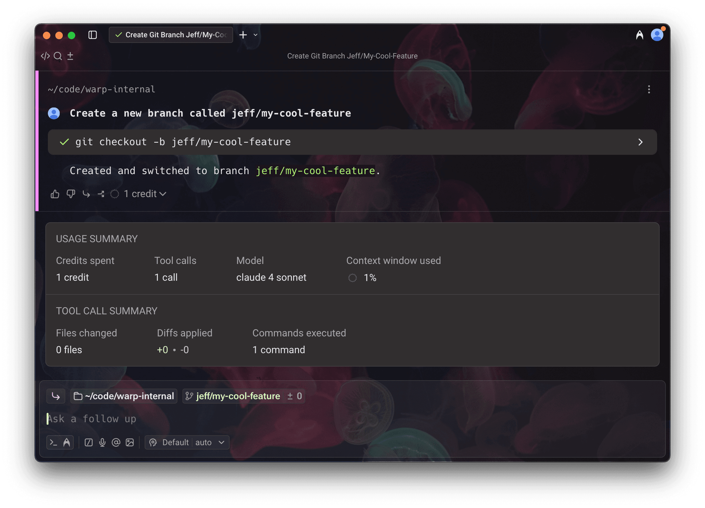 Each time you use Warp’s AI features, credits are consumed based on the interaction. At least one credit is used per request to an AI agent. For example, a simple prompt like “Create a new branch called jeff/my-cool-feature” might use one credit. In fact, in my testing, it totally does! You can check the number of credits used since your last user input to the agent via the informational tooltip at the end of the conversation.