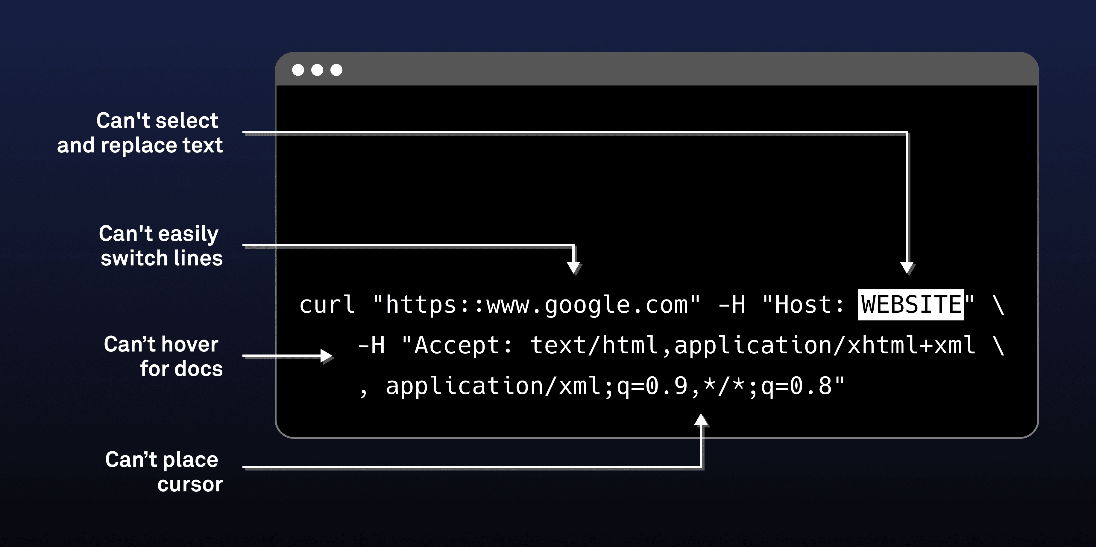 There are numerous problems with input editing in today’s command-lines. Mouse accessibility is broken, as described above. So is multi-line editing. In fact, the terminal input is in a lot of ways less powerful and user friendly than your typical <textarea> element on a web page, which is mouse-accessible, supports multi-line editing and has features like spell check built in.
