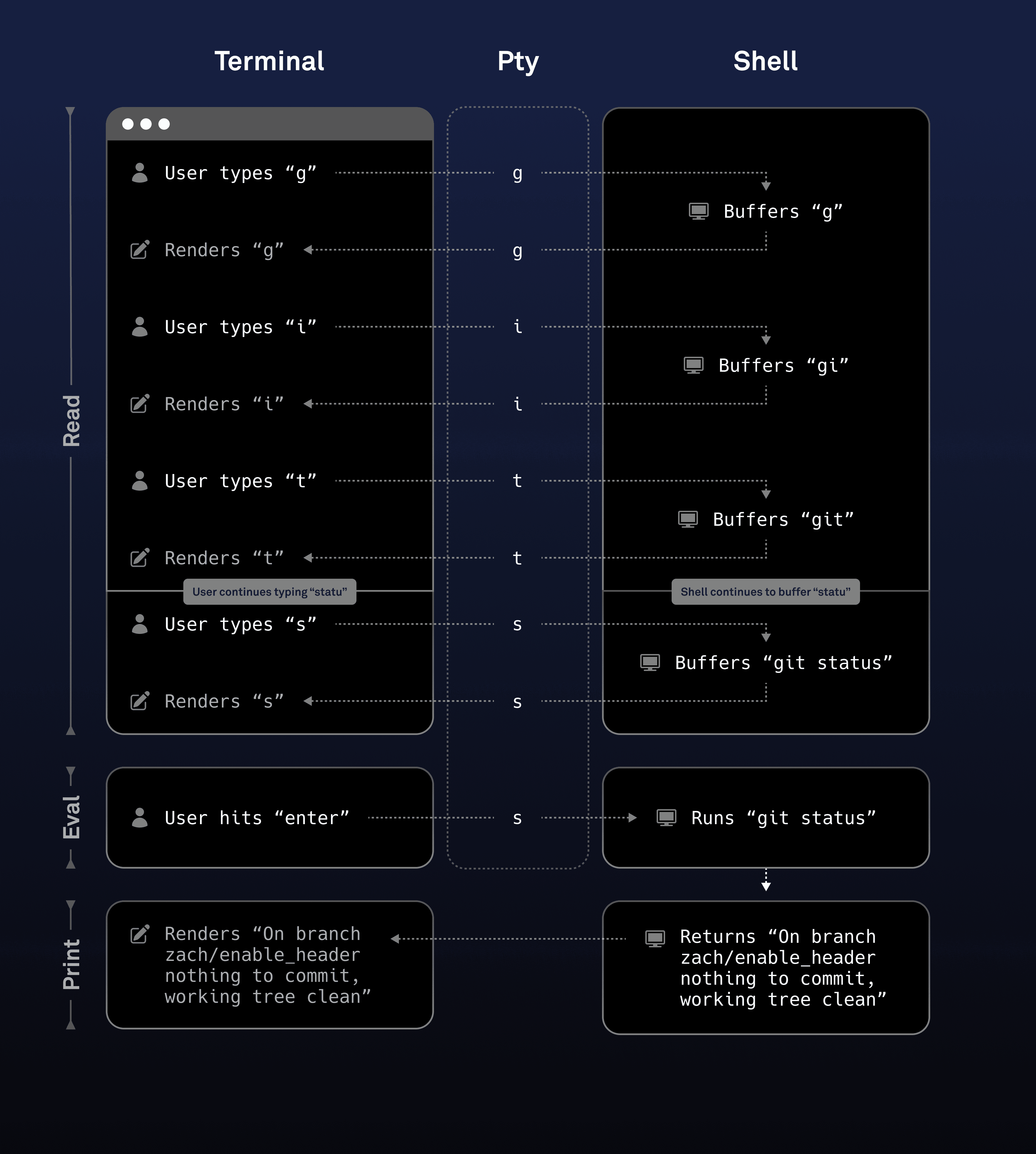 - Whatever program the shell runs will usually write its own responses a character a time back to the pty, and the terminal will print them. This is the print step.